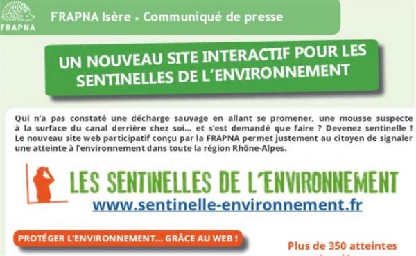Qui n?a pas constaté une décharge sauvage en allant se promener, une mousse suspecte à la surface du canal derrière chez soi... et s?est demandé que faire ? Devenez sentinelle ! Le nouveau site web participatif conçu par la FRAPNA, Fédération Rhône-Alpes de Protection de la Nature, permet justement au citoyen de signaler une atteinte à l?environnement dans toute la région Rhône-Alpes.